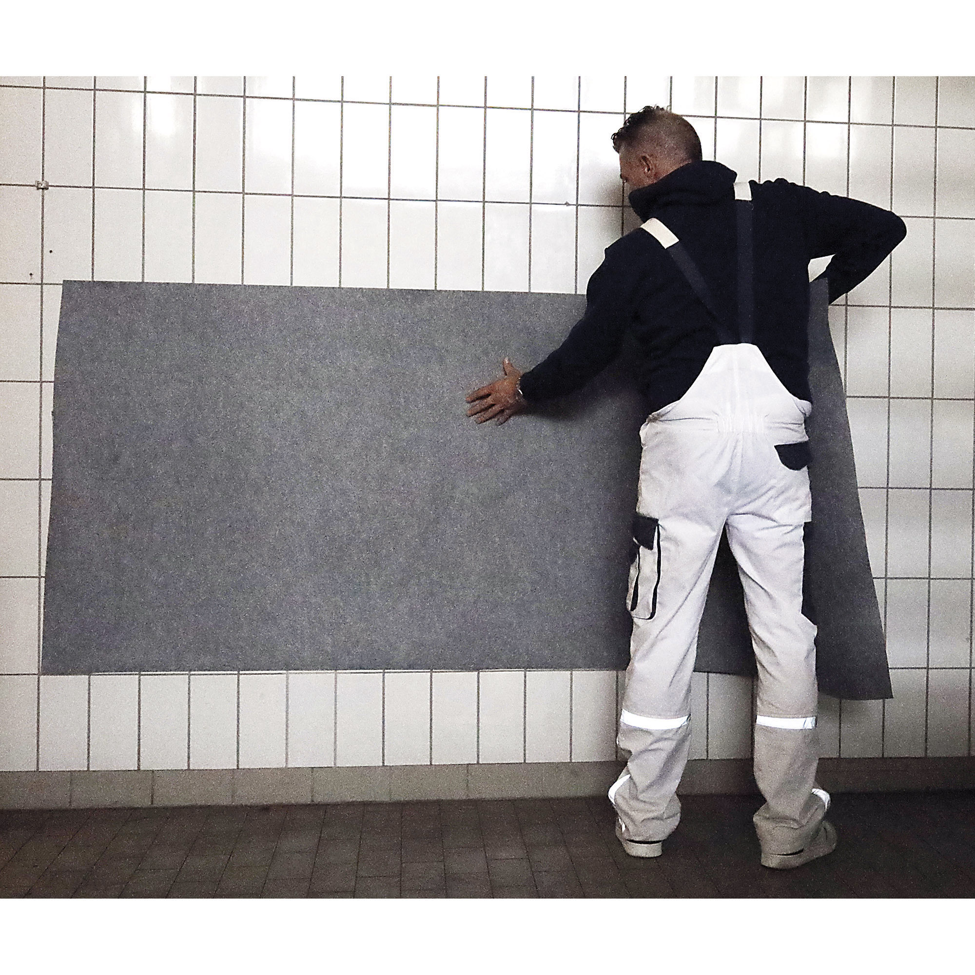 - Abdeckvlies mit der selbstklebenden Seite nach unten faltenfrei auf den Boden legen und fest andrücken