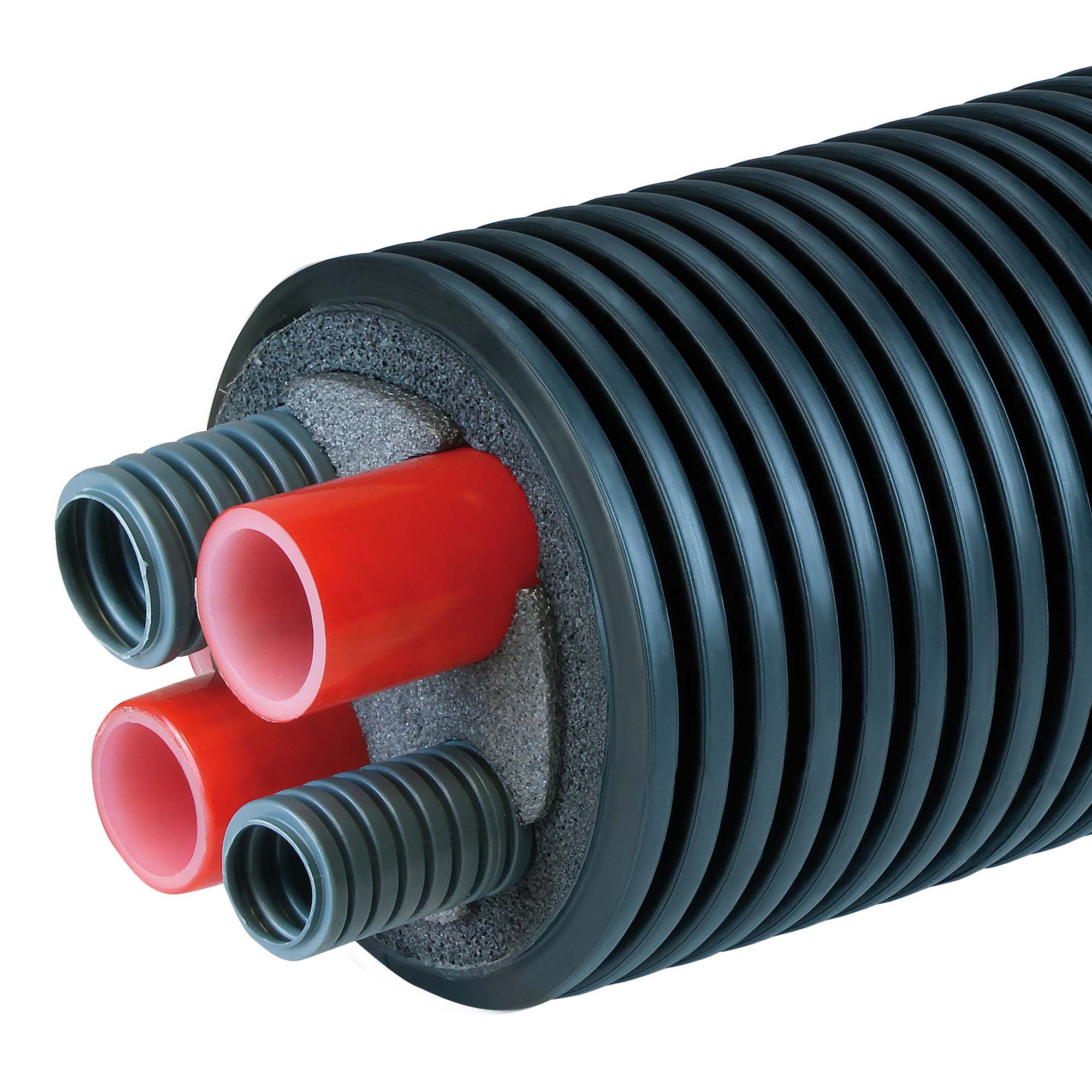 Das System besteht aus zwei PE-Xa Mediumrohren für Vorlauf und Rücklauf sowie zwei integrierten Leerrohren zur sicheren Führung von Steuerleitungen und Versorgungskabeln. Diese Konstruktion ermöglicht eine besonders einfache und sichere Installation und reduziert den Montageaufwand erheblich. Die hochwertige PE-X Dämmung mit geschlossener Mikrozellstruktur minimiert Wärmeverluste und sorgt für eine optimale Energieeffizienz der gesamten Wärmepumpenanlage.
