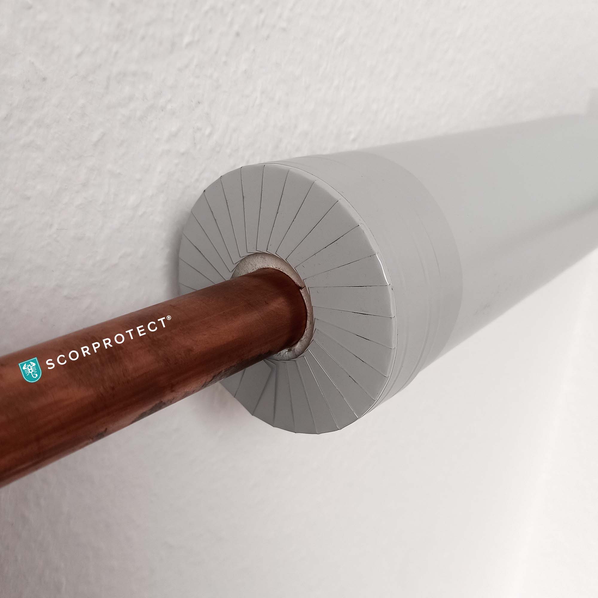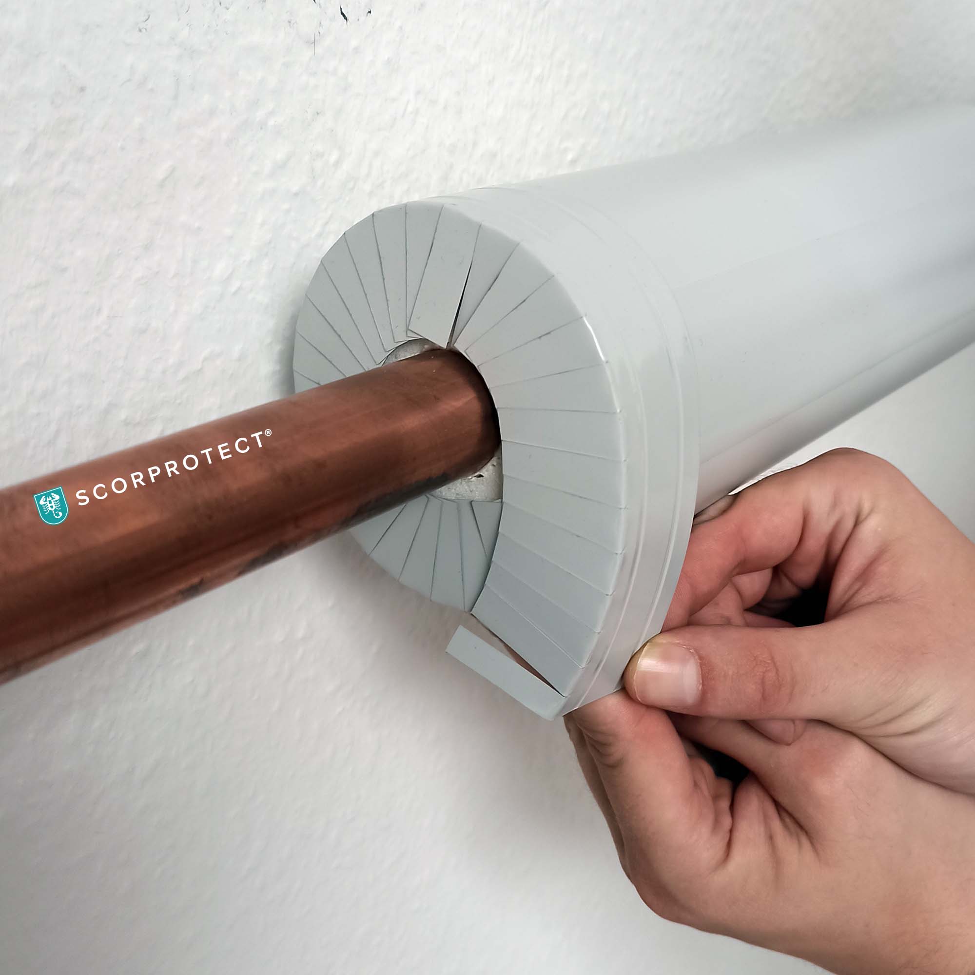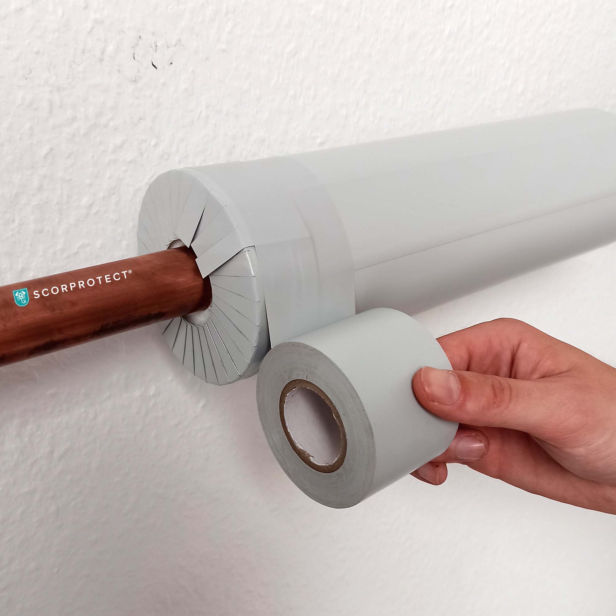 Das Endmanschettenband wird als Isolierabschluss zur sauberen Verkleidung eingesetzt. Beispielsweise kann es vor oder nach einem Absperrventil verwendet werden und schützt somit die Isolation vor mechanischen Schäden. Befestigt wird es einfach mit PVC-Klebeband hellgrau.