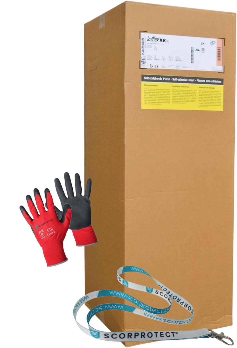Produktinformationen "Kaimann Kaiflex® KK Kautschuk Platte selbstklebend 25 mm + rote Handschuhe CAT2 + Scorprotect® Schlüsselband"