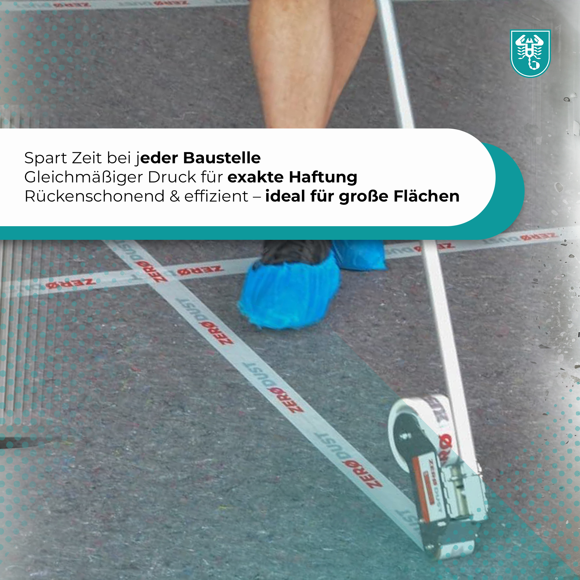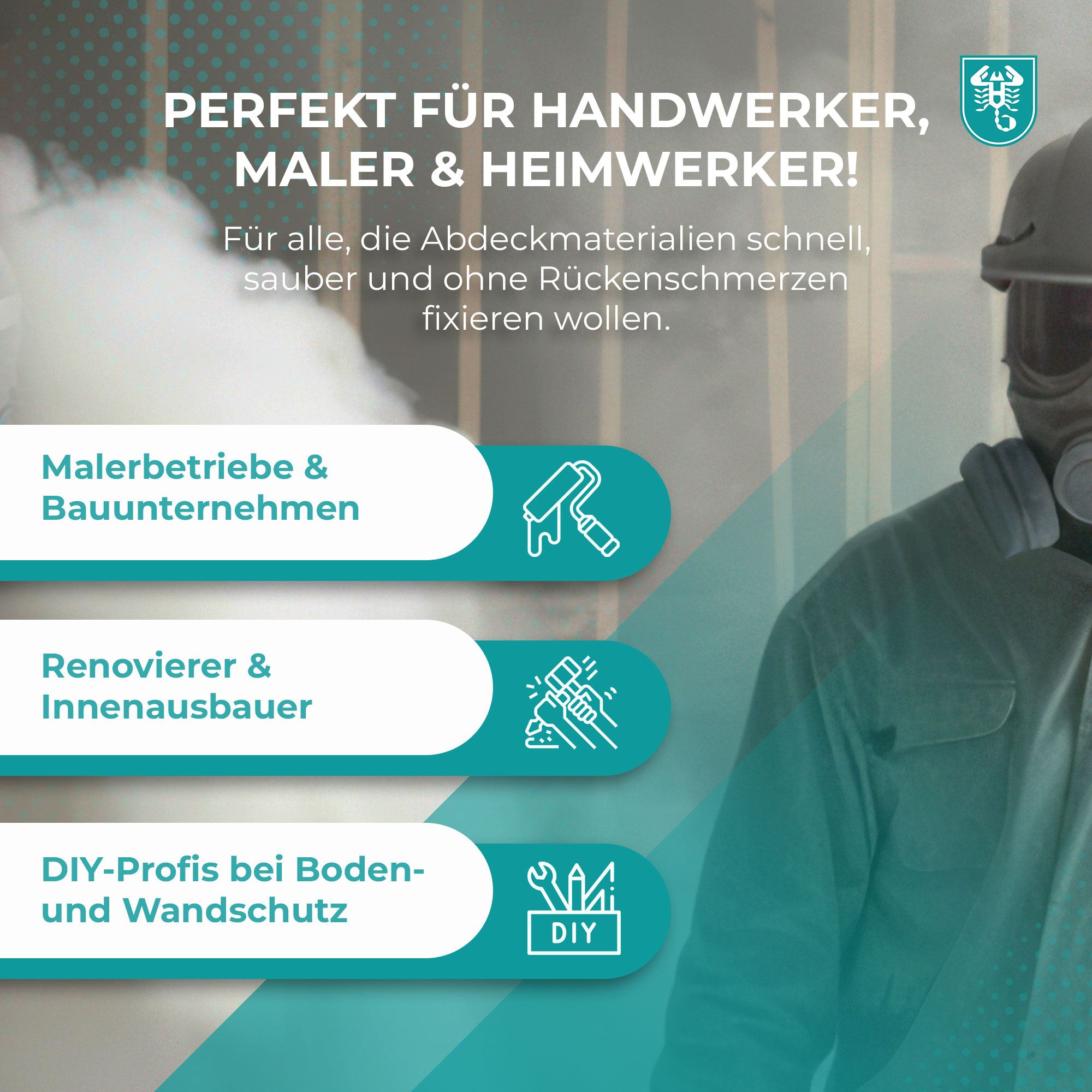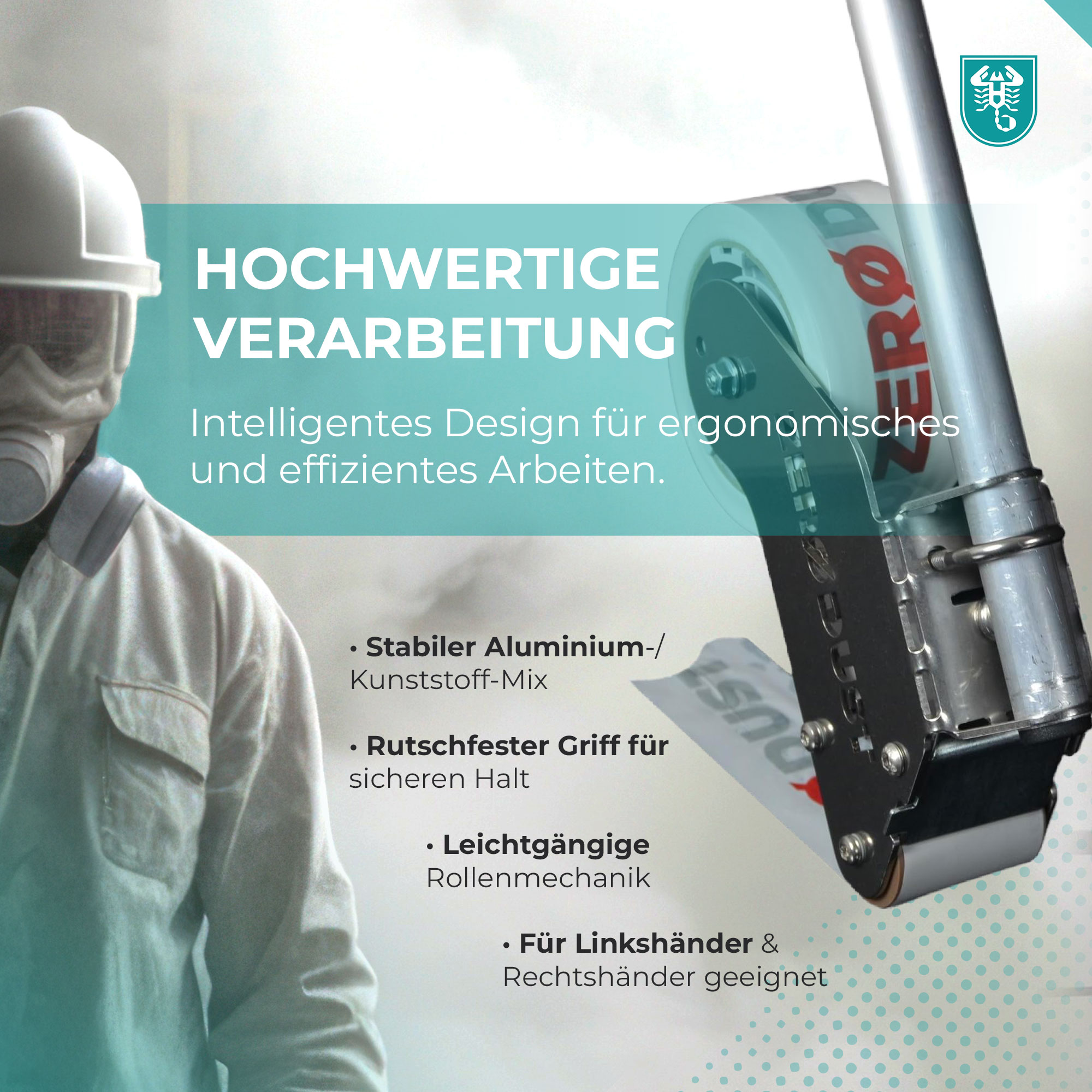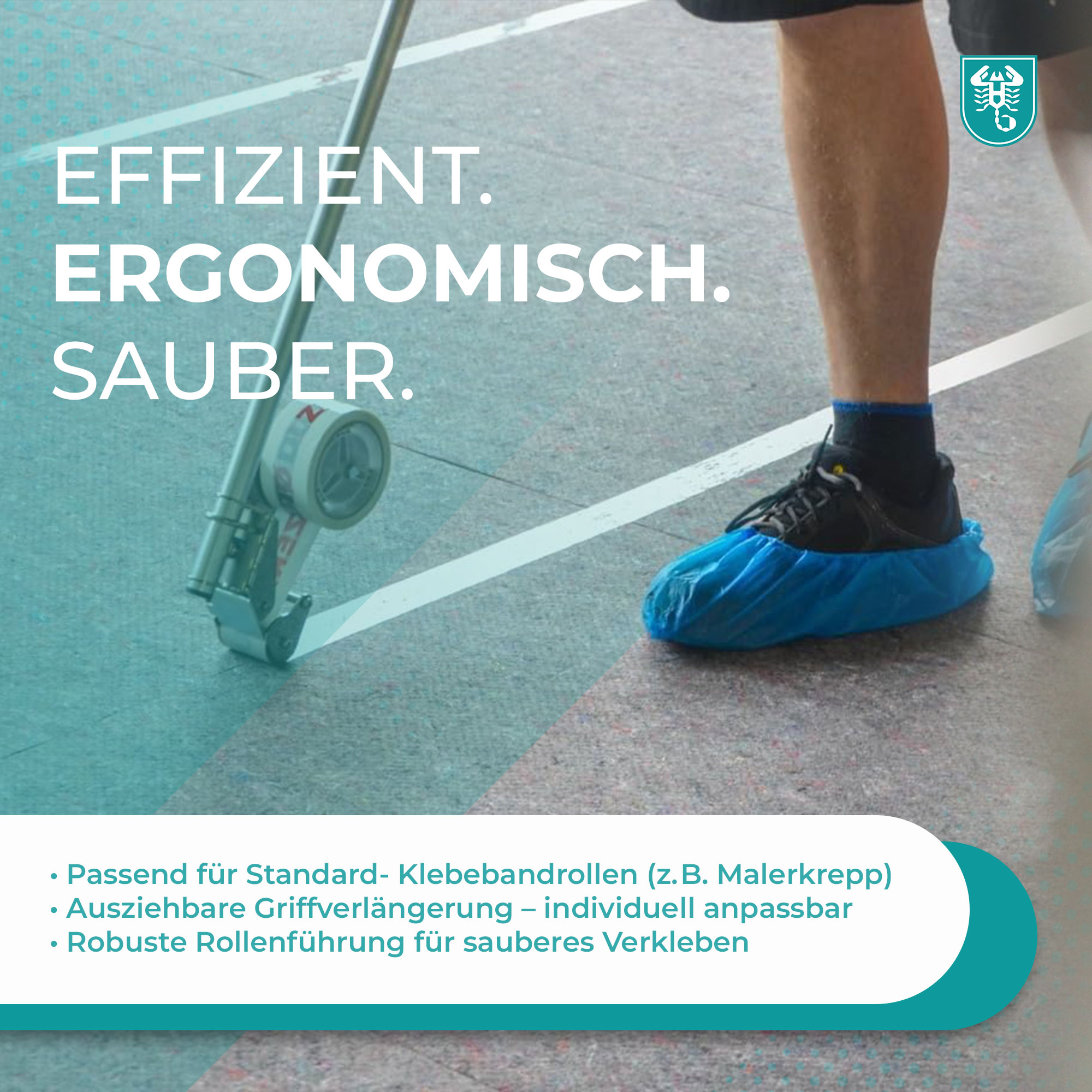 Unser Scorprotect ® Klebebandabroller "Taperoller" ist eine nützliche Klebeband Abrollhilfe mit Verlängerung um bequem im Stehen zu arbeiten. Ziehen Sie dafür einfach den „Taperoller“ Klebebandabroller mit eingelegtem Klebeband über die Verlegekanten um das Abdeckmaterial zu verkleben.