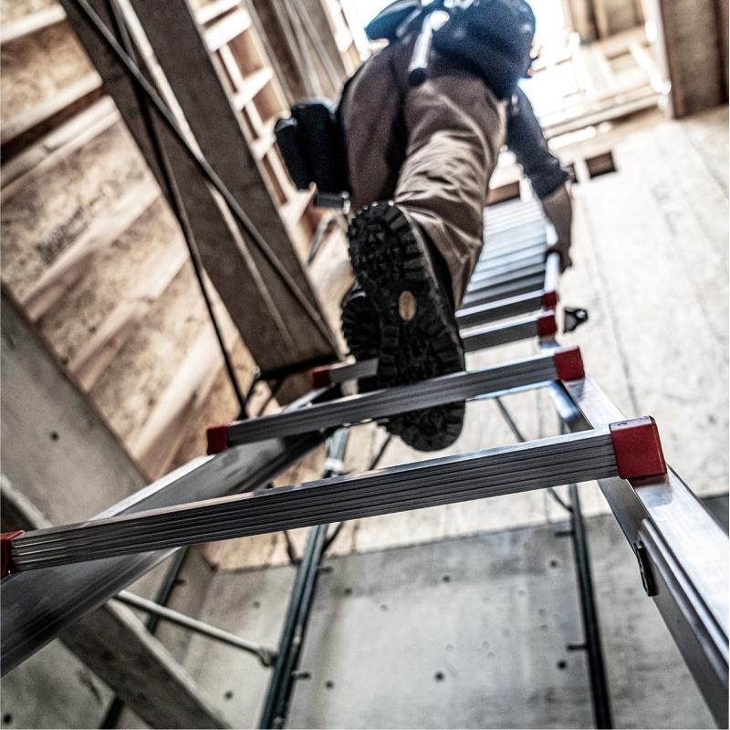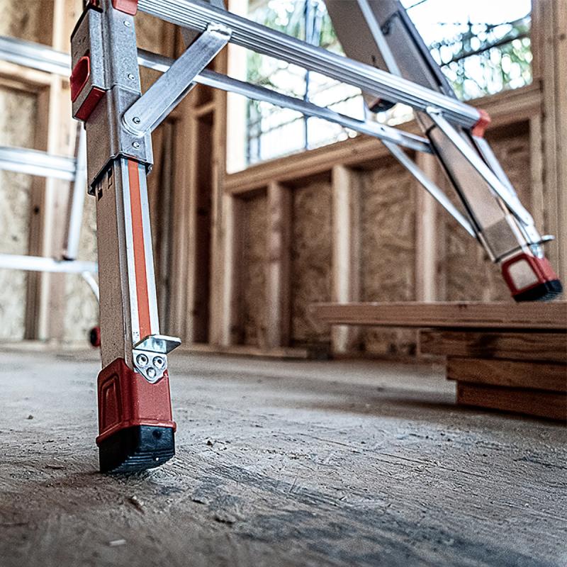 die Füße der Teleskopleiter in Sekundenschnelle verstellen. Dadurch
