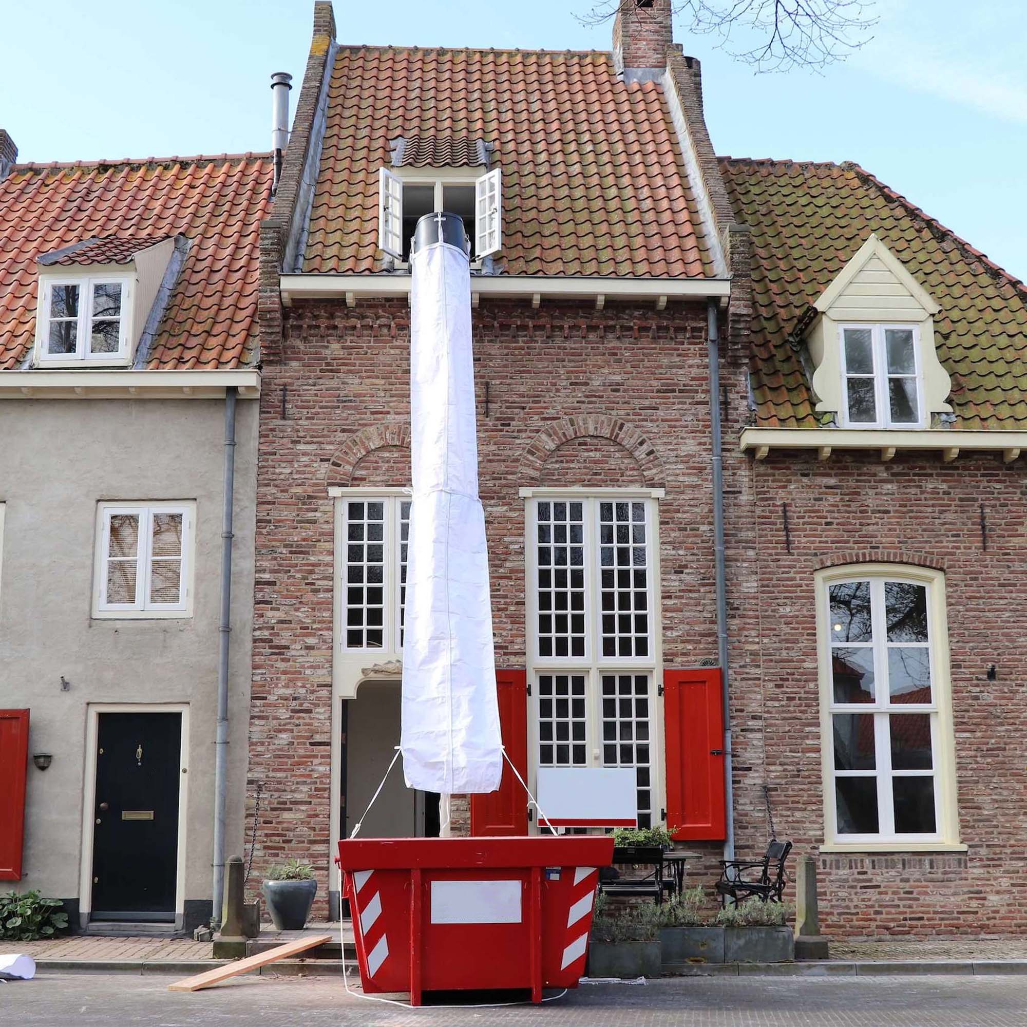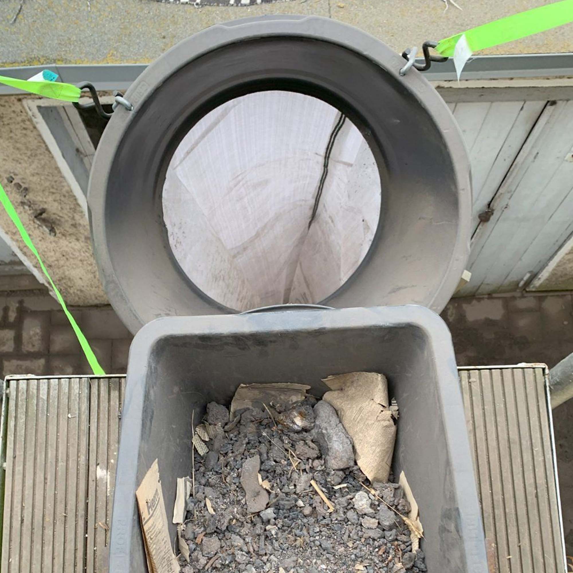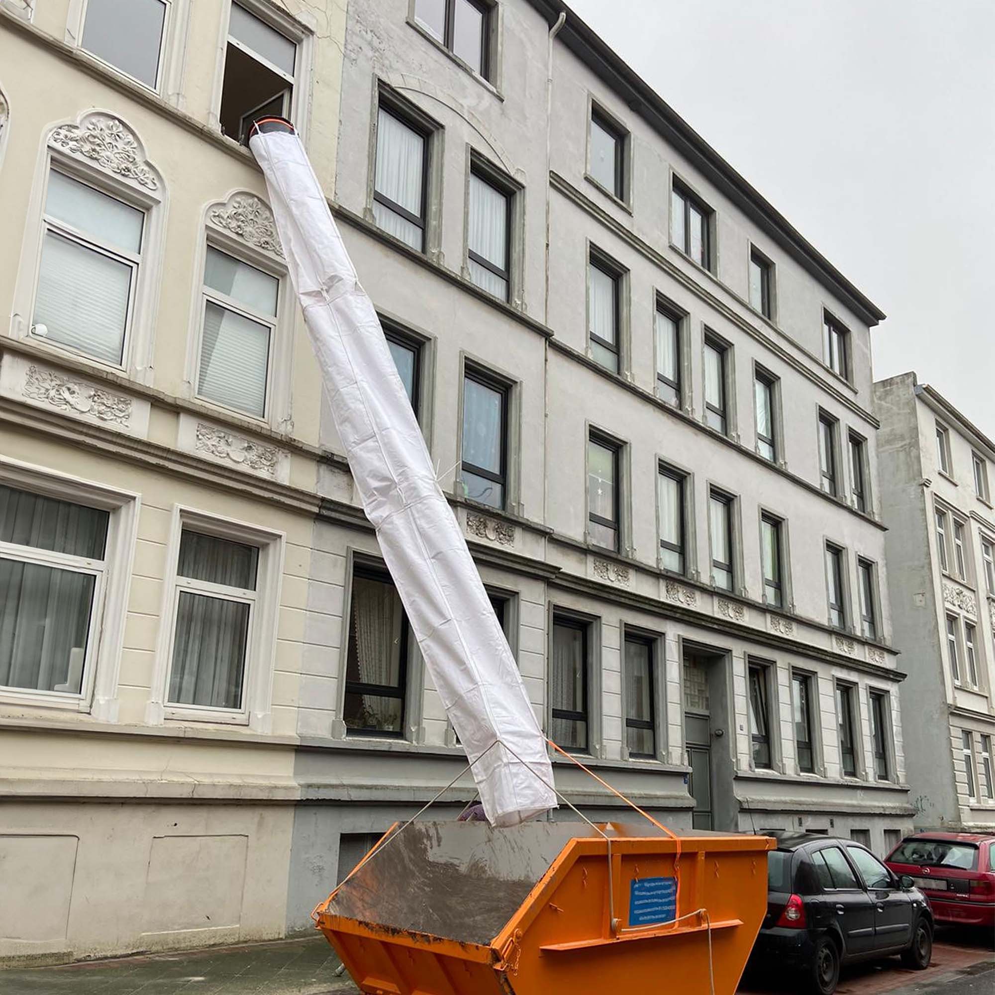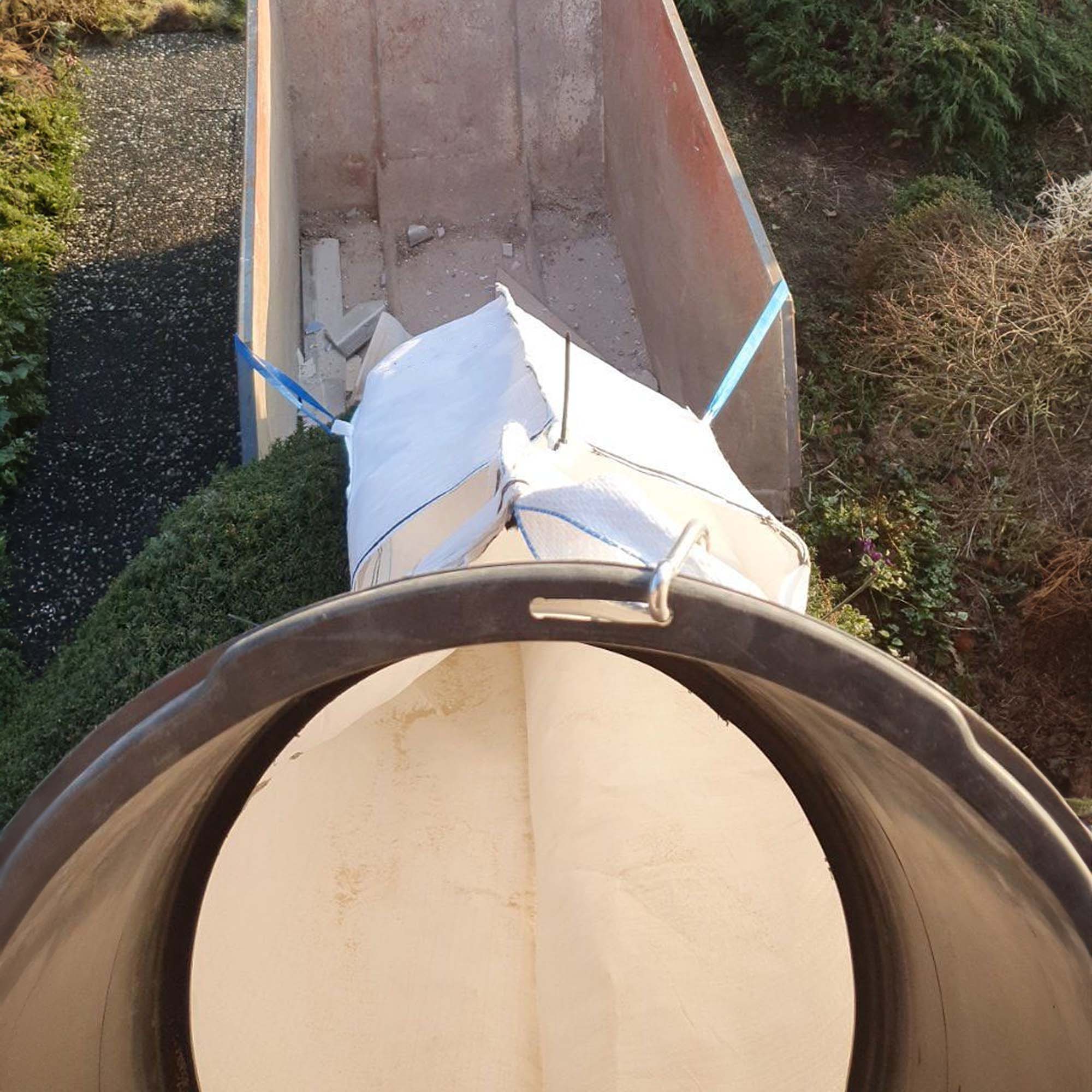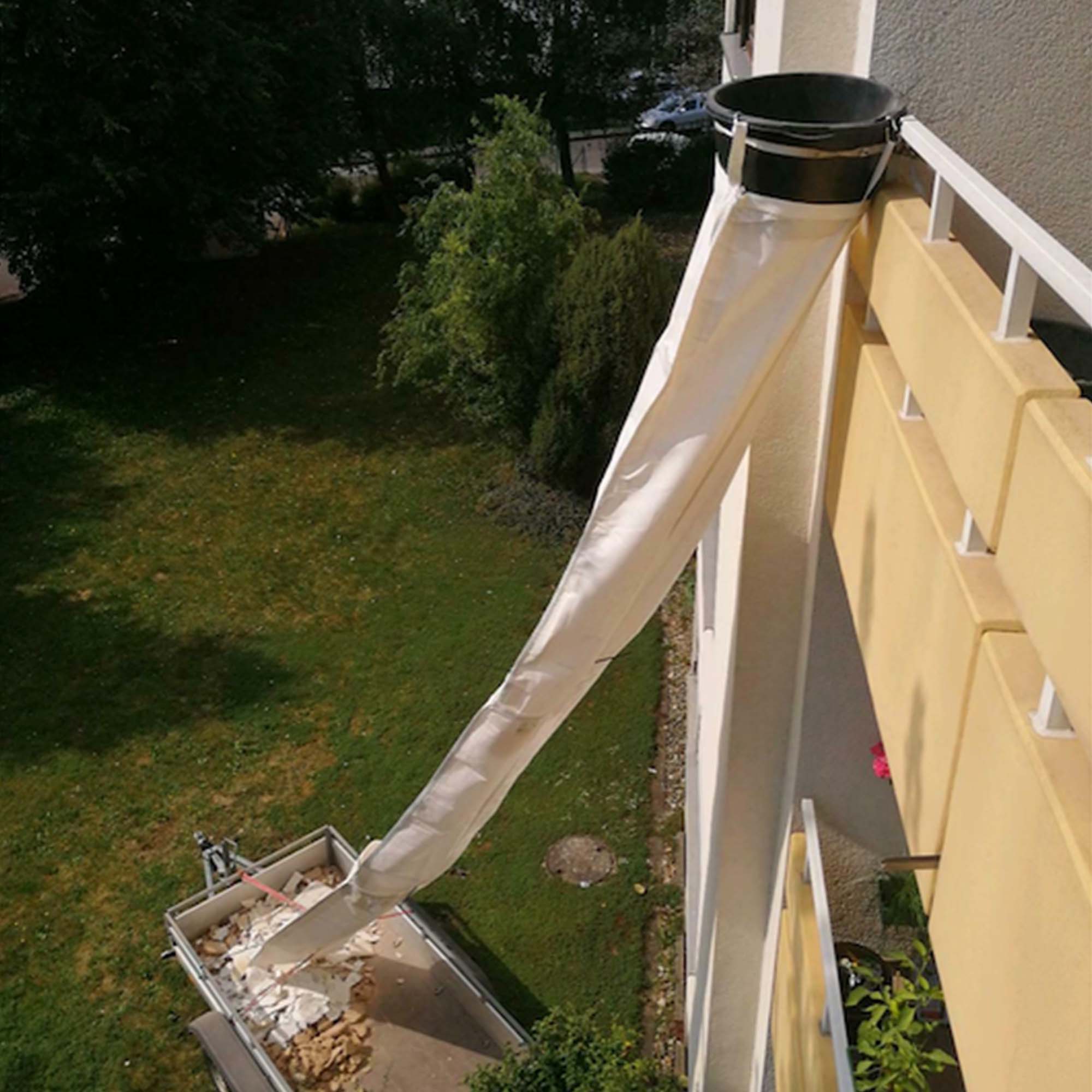 Der Einsatz einer schweren Schuttrutsche ist aufgrund der leichten flexiblen Zero Dust Schuttrutsche Bauschuttrutsche nicht mehr erforderlich.