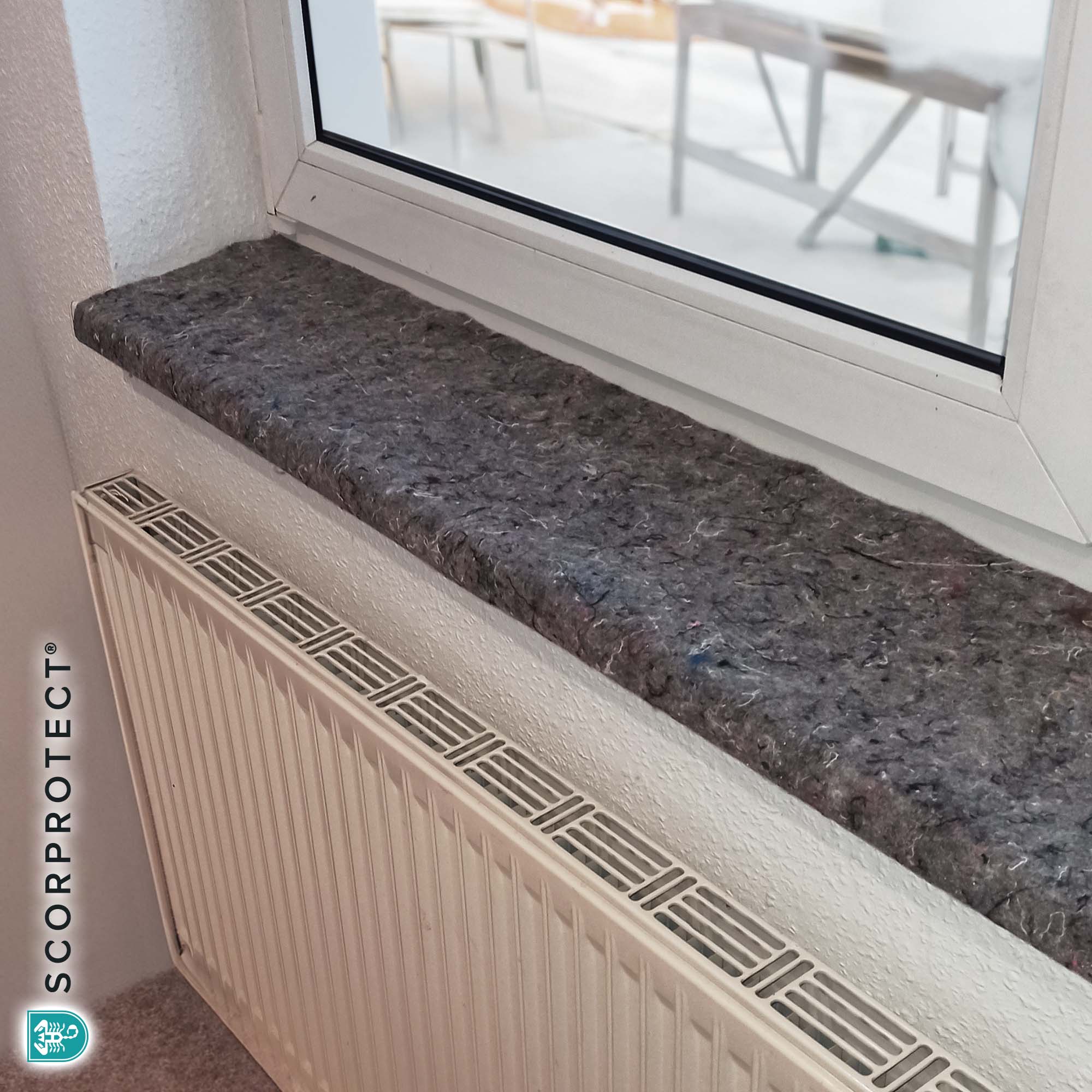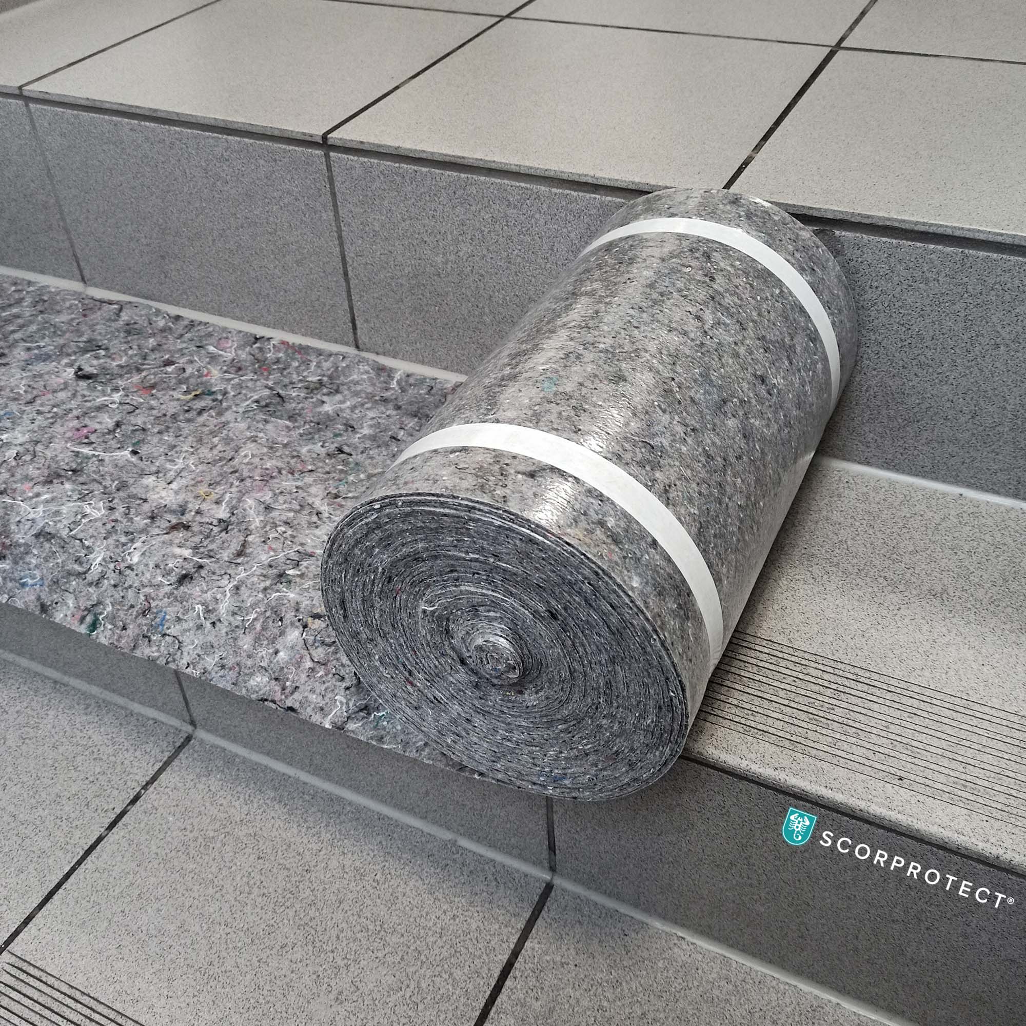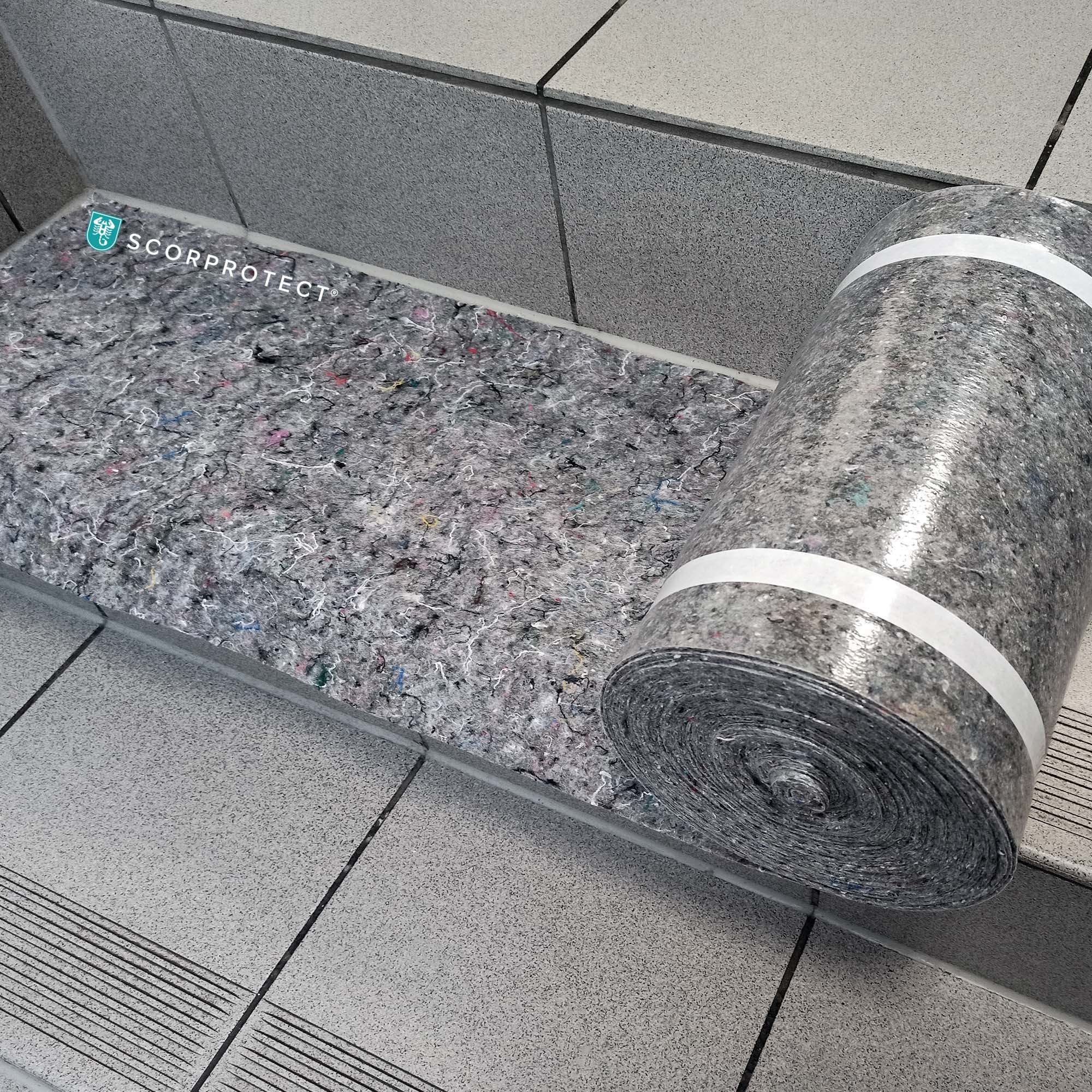 Das Scorprotect® TSV Treppenschutzvlies für die stufenweise Abdeckung von Treppen. Das TSV Treppenschutzvlies wird quer zur Laufrichtung der Treppenstufen ausgelegt und zugeschnitten.
